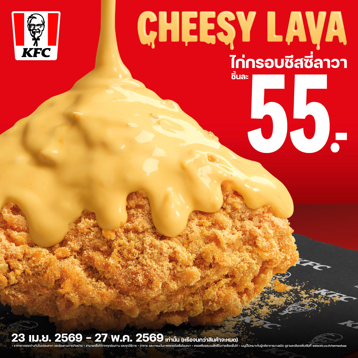 เตรียมรับแรงปะทะจากชีสที่ล้นทะลักพร้อมกันทั่วประเทศกับเมนู “ไก่กรอบชีสซี่ลาวา” เยิ้มจัดหนัก ผงจัดเต็มในราคาเริ่มต้นเพียง 55 บาท ตั้งแต่วันที่ 23 เมษายน – 27 พฤษภาคม 2569 ที่ KFC ทุกสาขาที่ร่วมรายการ โดยสามารถเช็ครายชื่อสาขาที่ร่วมรายการได้ผ่านทาง http://www.kfc.co.th/