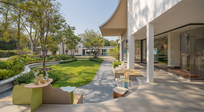 สำหรับ “ปัจจุบัน Playground” เป็นสนามเด็กเล่นที่พัฒนาขึ้นภายใต้แนวคิดการเรียนรู้ผ่านการอยู่กับปัจจุบัน โดยออกแบบให้เป็น Interactive Space ที่ชวนให้เด็กๆ และครอบครัวได้ใช้เวลาร่วมกัน ผ่านการเรียนรู้ 4 ปัจจัยหลัก ได้แก่ หาเหตุ, สังเกตเป็น, เย็นได้ และเปิดใจกว้าง ซึ่ง THINKK Studio ได้นำแนวคิดดังกล่าวมาถ่ายทอดผ่านการดีไซน์พื้นที่และเฟอร์นิเจอร์ให้สามารถใช้งานได้จริง ควบคู่ไปกับการกระตุ้นพัฒนาการของเด็ก ทั้งด้านการเคลื่อนไหว การสังเกต และการสื่อสาร รวมถึงการเสริมสร้างความสัมพันธ์ในครอบครัว